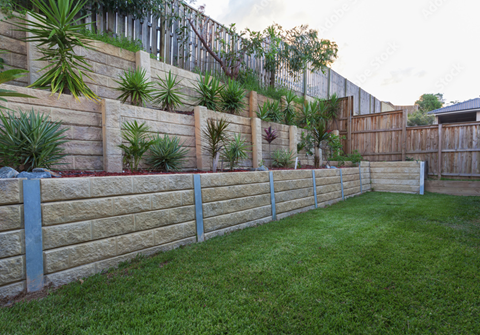 • Concrete Sleeper Retaining Walls – precast reinforced concrete sleepers supported by steel posts, commonly used in residential and commercial sites.